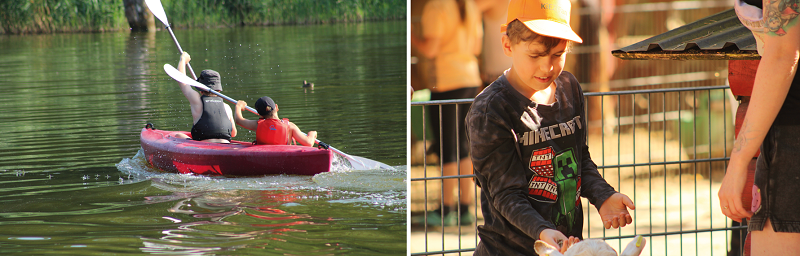 Bei der Verpflegung kann man zwischen Halb- und Vollverpflegung wählen, bei der Ferienwohnung ist auch eine Selbstverpflegung möglich. Individuellen Wünschen wie einer veganen Ernährung kommt die Küche nach vorheriger Anmeldung auch gerne nach. Die Freizeitangebote sind ebenso vielfältig: Paddelboote zum Ausleihen, Wälder zum Erkunden und die Seen laden im heißen Sommer zu einer schönen Abkühlung ein. Naturforscher entdecken am Hölzerner See im Haus des Wassers, welche Rolle das nasse Element in unserem Ökosystem spielt. Am Frauensee toben sich angehende Feuerwehrleute im Floriansdorf aus und Tierliebhaber kommen im KiEZ-eigenen Tierpark auf ihre Kosten. Hier erschaffen Kinder einzigartige Erinnerungen und finden neue Freund:innen.