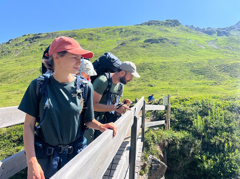 Für das Wandern mit Baby ist es sehr hilfreich eine feste Routine zu finden. Wir hatten nach ein paar Tagen unseren Rhythmus gefunden. Zum Glück sind die Tagesabläufe in den Hütten sehr babyfreundlich. Frühstück gibt es zwischen 7 und 8 Uhr, Abendbrot um 18 Uhr, Hüttenruhe ist um 22 Uhr. Emilijan ist immer zwischen 6 und 7 Uhr aufgewacht, dann gab es Frühstück. Vorher haben wir schon ein bisschen gepackt und nach dem Frühstück freut sich das Hüttenteam, wenn alle Wanderer möglichst schnell losziehen, so dass Zeit bleibt, die Hütte aufzuräumen und sich für den Mittagsansturm zu rüsten. In der Niederelbehütte trafen wir morgens beim Losmarschieren die Wegebau-Gruppe unserer Sektion Kiel. Ein zufälliges Aufeinandertreffen der Wanderfans aus dem hohen Norden in den hohen Bergen!