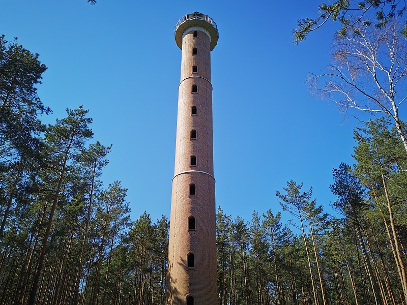 Diese gut acht Kilometer lange Rundtour führt unter anderem am Luckaitztaler Ziegelturm vorbei – einem knapp 40 Meter hohen Klinkerturm inmitten in der Calauer Schweiz. Während der Rundweg selbst auch für robuste Kinderwagen geeignet ist, müssen die 216 Stufen bis zur Aussichtsplattform zu Fuß erklommen werden. Doch das lohnt: Der Blick reicht bei klarer Sicht bis zur Calauer Stadtkirche im Norden, bis nach Cottbus und zum Kraftwerk Jänschwalde im Nordosten, zum Besucherbergwerk F 60 bei Finsterwalde im Südwesten und ins Lausitzer Bergland im Süden. Ansonsten führt der Rundweg durch stille Wälder mit Blaubeerteppichen, durch kleine Dörfer mit Feldsteinhäusern und vorbei an alten Wassermühlen. Die Gasthäuser in den Plinsdörfer Weißag und Zwietow öffnen unregelmäßig, hier unbedingt vorab informieren. Wenn sie offen haben, lohnt ein Besuch wegen der köstlichen Buchweizenplinse. Wer den kompletten Rundweg abläuft, hat 187 Meter Höhenunterschied zu bewältigen, wird dafür aber mit wechselnden Landschaftseindrücken und Sichtachsen belohnt.