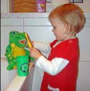 Frau Wolf zeigt, wie es geht und Leni, zwei Jahre alt, macht es fast perfekt