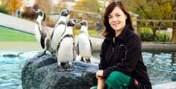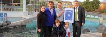 Übergabe der Patenurkunde im Pinguingehege v.l.n.r.: Tierpflegerin Laura Schäfer, Badleiter Axel