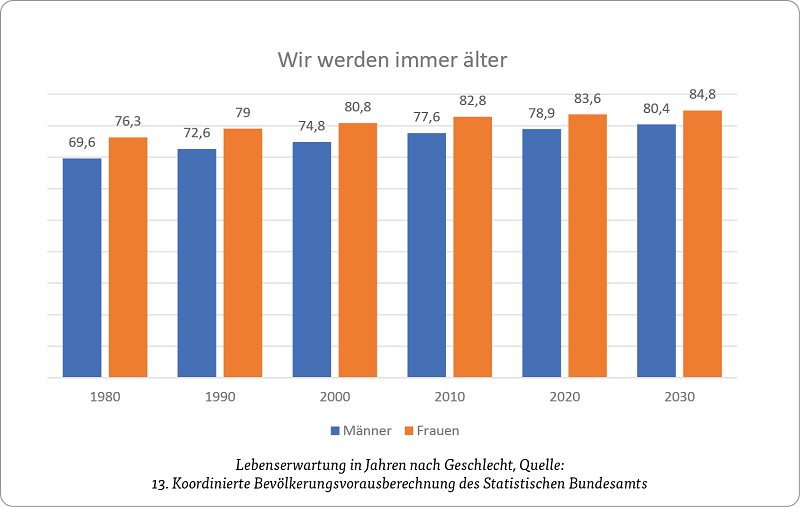 Die Deutschen leben immer länger. Medizinischer Fortschritt, steigender Wohlstand oder auch zunehmend gesündere Lebensweisen zählen zu den Gründen. Verschiedene Studien und Prognosen übersetzen die verlängerte Lebensdauer in Zahlen. Segneten unsere Urahnen Ende des 19. Jahrhunderts noch mit rund 50 Jahren das Zeitliche, erreichte die Lebenserwartung 1980 schon rund 70 (Männer) bzw. 76 Jahre (Frauen). Bis 2030 könnten es nochmals rund zehn Jahre mehr sein.