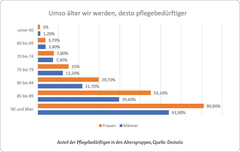 Für die Altenpflege bringt das gewisse strukturelle Probleme mit sich. Umso älter man wird, desto höher ist die Wahrscheinlichkeit, dass man Pflegeleistungen in Anspruch nehmen möchte bzw. muss. Das zeigt eine Statistik von Destatis, wonach in der Altersgruppe Ü85 mehr als jede zweite Frau und gut ein Drittel der Männer gepflegt werden müssen. Mit wachsender Lebenserwartung erhöht sich auch die Dauer, wie lange einzelne Personen gepflegt werden – und mit dem Alter auch die Intensität der Pflege.