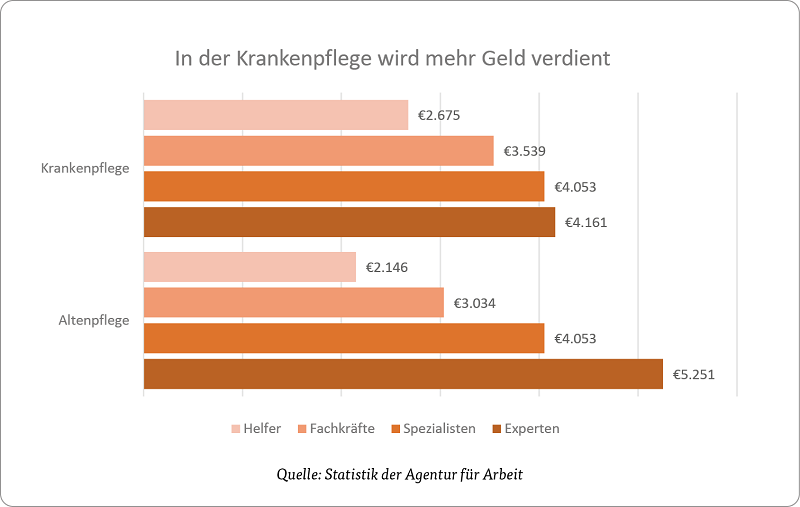 Dennoch konnte die Ausbildungsreform in der Pflege nicht für ein spürbar größeres Interesse am Altenpflege-Berufsbild sorgen. Der Grund dafür liegt in unterschiedlichen Gehältern – so verdienen Hilfs- und Fachkräfte in der Krankenpflege rund 500 Euro mehr. Warum sollte man sich als frisch ausgelernte Person dann für eine Arbeitsstelle in der Altenpflege entscheiden?