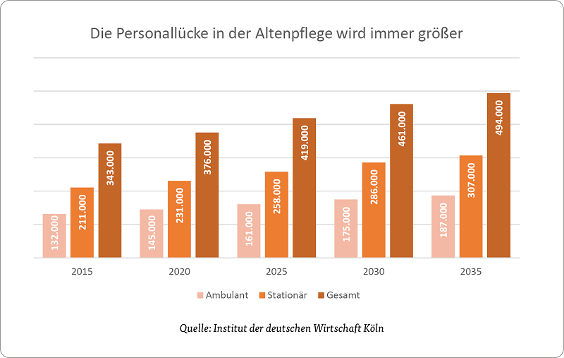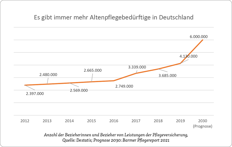 Alles in allem wird mit der Zahl der Pflegebedürftigen auch die Personallücke in der Pflege immer größer. Rund 6 Millionen Deutsche könnten laut dem Barmer Pflegereport 2030 pflegebedürftig sein – rund 50 Prozent mehr als aktuell. Zu zwei aktuellen Pflegeeinrichtungen müsste eine weitere dazugebaut werden, um den Bedarf decken zu können. Nötig sind bis 2030 dafür weit über 400.000 weitere Pflegekräfte.
