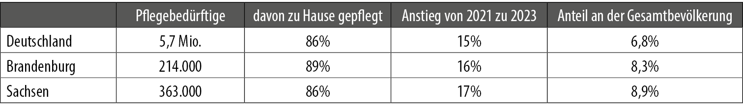 In Brandenburg setzt die neu Koalition aus SPD und CDU in der Pflege ähnliche Schwerpunkte wie die Vorgängerkoalition. Ziel ist weiterhin, dass pflegebedürftige Menschen möglichst lange im heimischen Umfeld versorgt werden können. Bereits im November war der „Pakt für Pflege 2.0“ beschlossen worden, der unter anderem Förderprogramme für Kommunen und Landkreise vorsieht. Die Landesregierung stellt dazu jährlich elf Millionen Euro zur Verfügung, u.a. für den Ausbau von Angeboten wie Nachbarschaftshilfe, gemeinsames Mittagessen oder Schulungen für pflegende Angehörige.
