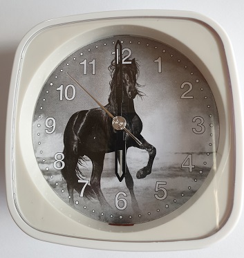 Dieser Quartz-Kinderwecker besticht durch sein schönes Design, eine einfache Handhabung und natürlich das schöne Pferde-Motiv. Das Gehäuse besteht aus hochwertigem Kunststoff. Die Maße betragen 9,6 x 9,6 x 4,5 cm und eine Beleuchtung mit weissem Licht ist integriert. Ein hochwertiges, schleichendes Uhrwerk sorgt für ruhigen Schlaf und der Alarm ertönt leicht aufsteigend. Die Weckwiederholung ertönt bei Betätigung der Licht/ Snoozetaste nach ca. 5 Minuten.