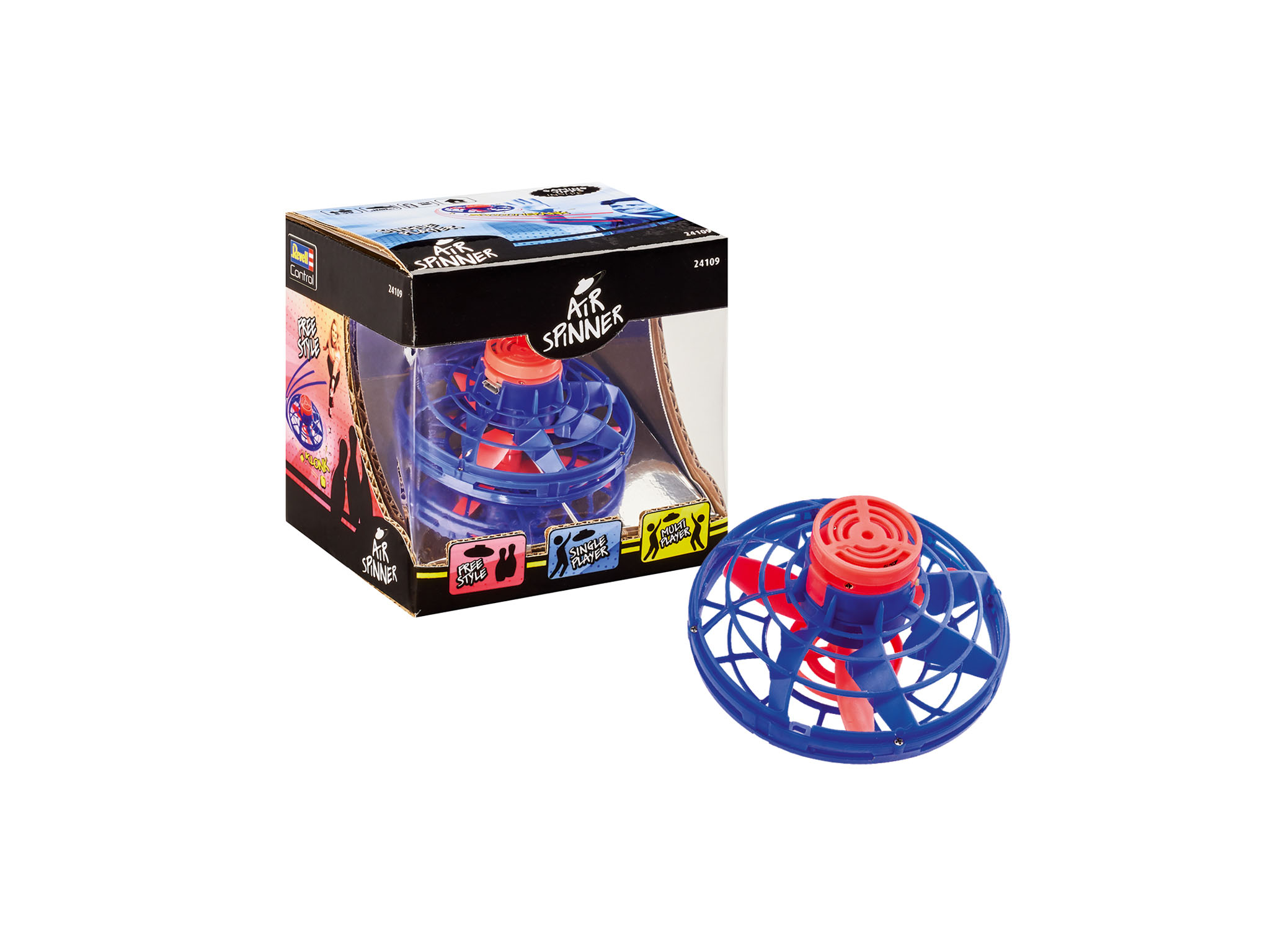 Der innovative Air Spinner von Revell Control sorgt für Spielspaß mit der ganzen Familie. Das verrückte Fluggerät wird zwischen Daumen und Zeigefinger festgehalten und mit der anderen Hand in Rotation versetzt. Der Motor startet und je nach Wurfwinkel nimmt der Air Spinner ordentlich Vorwärts-Speed auf oder kommt wie ein Bumerang zum Werfenden zurück. Das sorgt für jede Menge Action! Das vielseitige Gadget kann im Teamplayer, Single oder Freestyle Modus geworfen werden – mit Freunden oder allein. Stürze sind dabei kein Problem: Die robuste Bauweise macht den Air Spinner widerstandsfähig. Geladen wird der Air Spinner bequem per USB-Kabel am PC sowie unterwegs über den Laptop. Mit mehreren Air Spinnern gleichzeitig – erhältlich in zwei verschiedenen Farbvarianten – sind auch coole Tricks und spannende Challenges möglich. © Revell