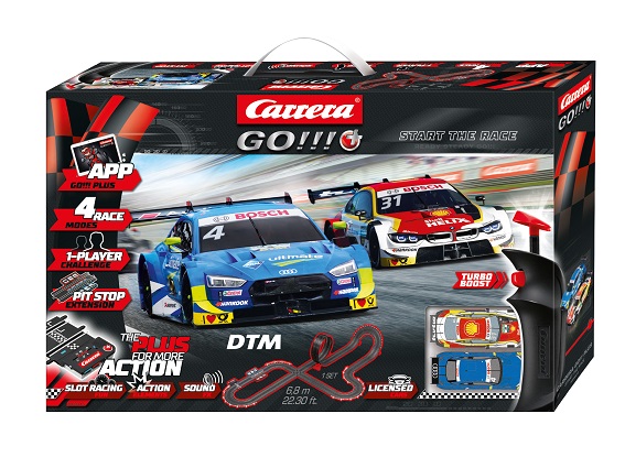 Zwei DTM-Lieblinge geben Vollgas - Große und kleine DTM Fans kommen im neuen Carrera GO!!! Plus „DTM Start the Race“-Set voll auf ihre Kosten. Die Rennboliden von BWM und Audi haben mit über 600 PS ordentlich Power unter der Haube und sorgen so für spannende Rennen. Mit Carrera GO!!! Plus wird die Rennstrecke auch noch smart und zusätzlich sorgt sie mit Looping, Fly-Over und Kreuzung für jede Menge Action. Über die Carrera GO!!! Plus App starten die Rennfahrer ab 6 Jahren in verschiedene Spielmodi wie Verfolgung oder Zeitrennen und erleben mit der eingebauten Pit-Stop-Lane coole Minispiele wie Tankfüllung, Reifenwechsel oder Motorschaden.